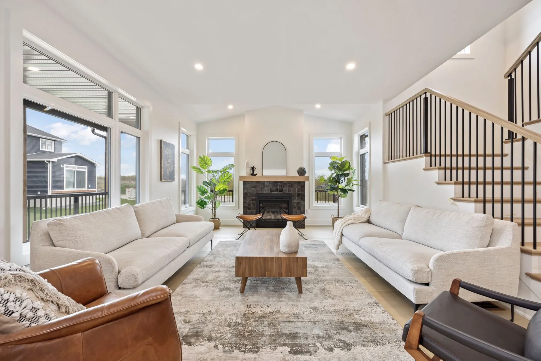 - -White Oak stairs & handrail with black metal spindles, custom stain to compliment hardwood floors.