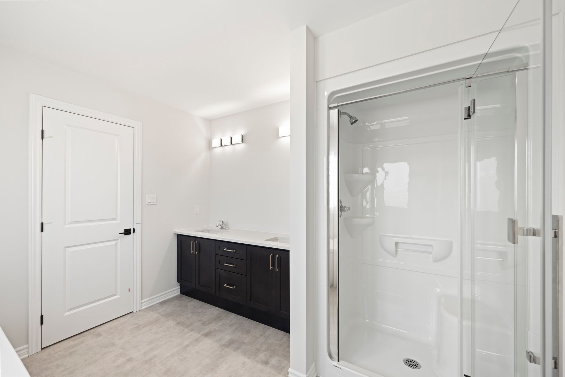 • -One piece shower enclosure with roof cap and pivot door installed in ensuite bath.