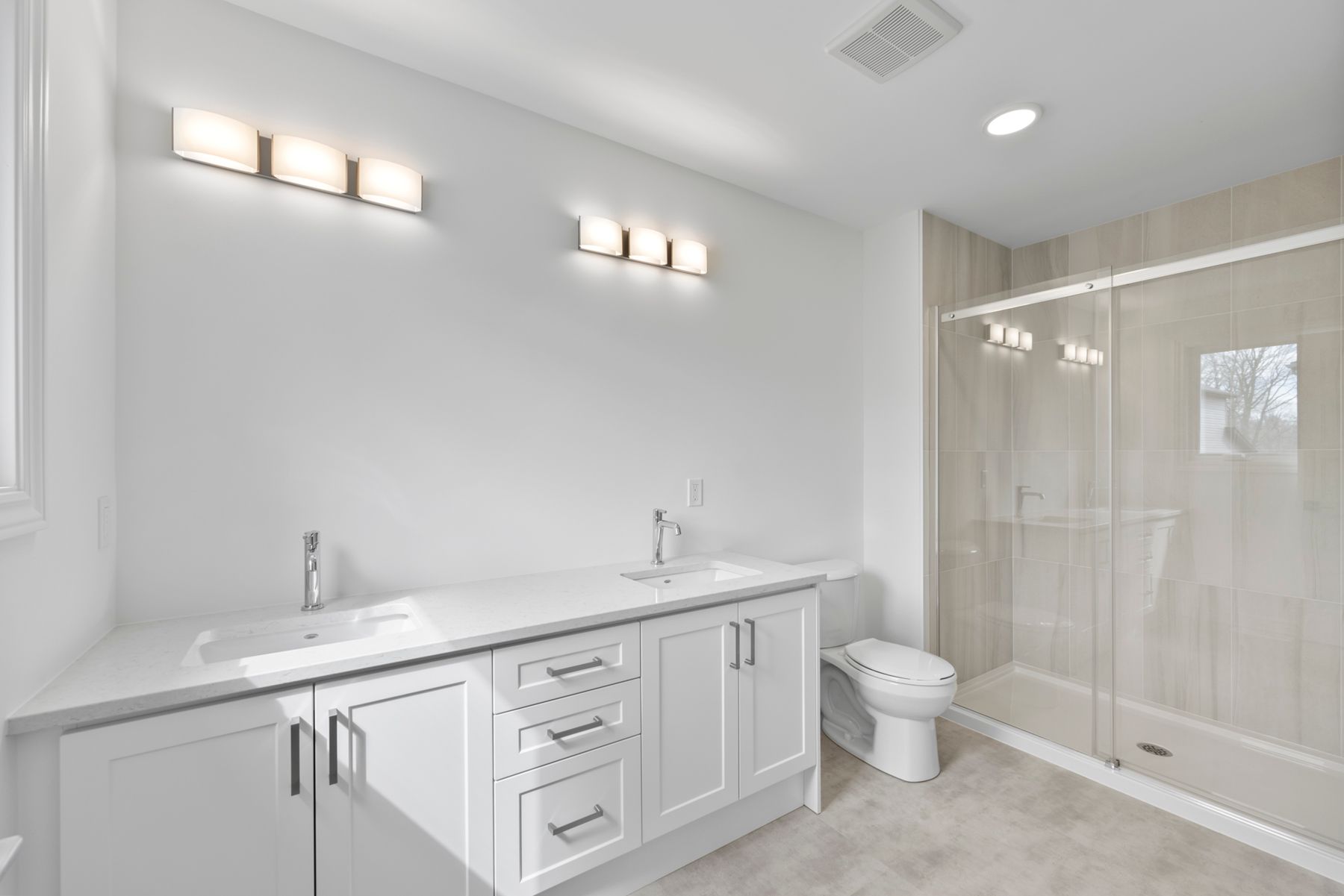 • -Tiled shower with acrylic base and glass door for ensuite bathroom.